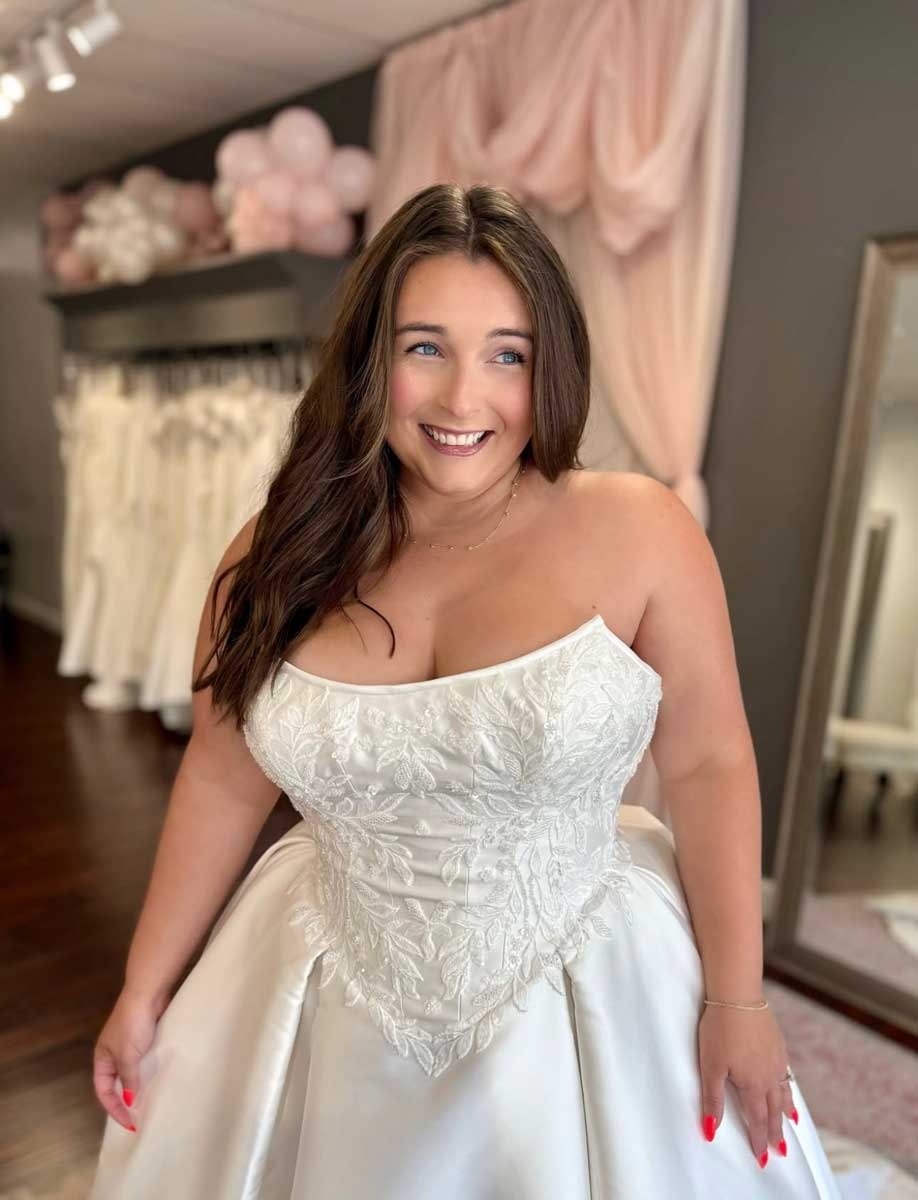 Inside the gown, you’ll feel flexible boning, soft-touch linings, and supportive cups that let you breathe and hug without thinking about it. We check the sit, walk, and twirl test in every appointment so you feel secure and free.